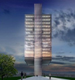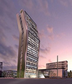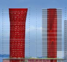 El proyecto original del Arquitecto japonés Toyo Ito perfeccionado luego por el b720 arquitectura de España propone un desafío importante al tratar a las dos torres como complementarias entre si (una el ying y otra el yang, una el positivo la otra el negativo, una lo cerrado la otra lo abierto). Esta fuerte idea bipolar se refleja en la fachada. El hotel tiene una fachada de compleja geometría con una superficie reglada que cambia en cada planta dando una envolvente cambiante sin coincidir con la plomada ni tener ángulos rectos en ningún momento. Nuestra solución fue proponer una doble piel donde la interior maciza, resistente, aislante, estuviese vertical, y la exterior: abierta, liviana, recompone exactamente la geometría propuesta por los arquitectos, casi como un “Bosque de Bamboo” construida con tubos redondos de aluminio separados entre si que “refrescan” la fachada interior.
